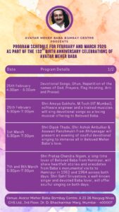 AVATAR MEHER BABA’S 132ND BIRTH ANNIVERSARY CELEBRATION TOMORROW AT THE BOMBAY CENTRE It would be fun participating ! Do come and partake of His Blessings of Love. JAI BABA!!!